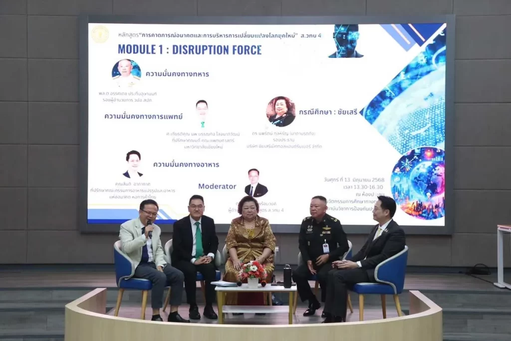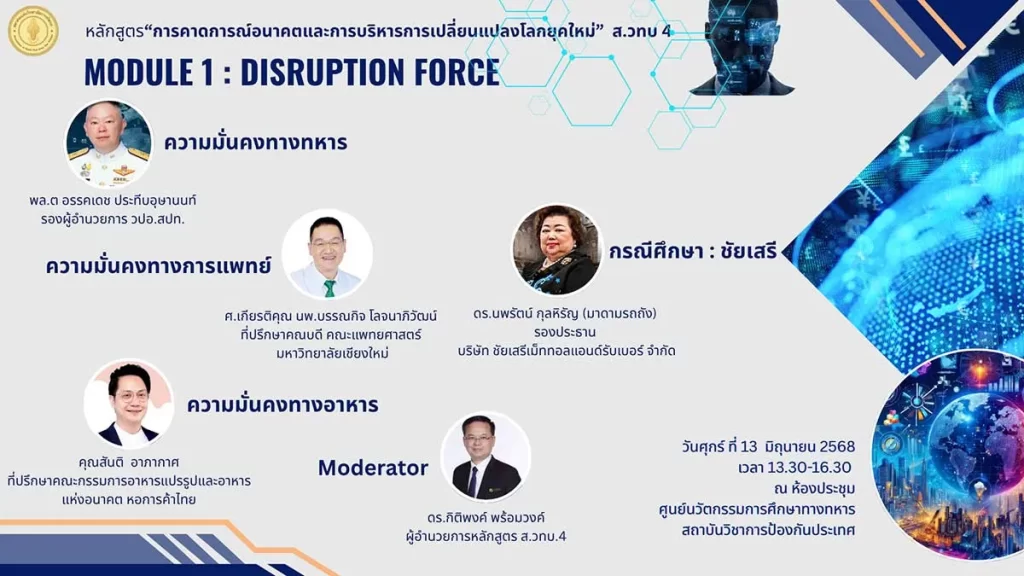 ในวันที่ 13 มิถุนายน ได้มีการจัดการอบรมหลักสูตร ส.วทบ. รุ่นที่ 4 (ส.ทบ. 4) เป็นวันแรก ภายใต้หัวข้อ Module 1 : Disruption Force โดยมีวัตถุประสงค์เพื่อสร้างความตระหนักรู้ถึงแรงกระเพื่อมที่มีผลต่อการเปลี่ยนแปลงในหลากหลายมิติ ซึ่งได้รับเกียรติจากวิทยากรผู้ทรงคุณวุฒิจากภาครัฐ ภาควิชาการ และภาคเอกชน มาร่วมถ่ายทอดความรู้และประสบการณ์ในประเด็นต่างๆ ดังนี้